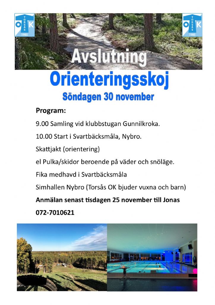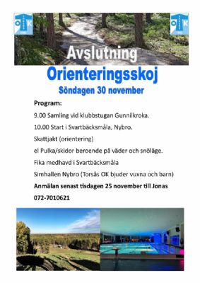 Söndagen 30 november har vi höstavslutning för Orienteringsskoj i Svartbäcksmåla, Nybro. I bifogat program har vi tider som gäller för dagen. Vi har 2 alternativ på program pga vädret. Det troliga är att snön är borta eller att det är bara lite kvar. Då kör vi orientering med skattjakt. Skulle det vara snö kvar åker vi pulka/skidor. I båda fallen avslutar vi med bad i Nybro simhall. Vi hör av oss i veckan om vad det blir. Välkomna med på en trevlig dag tillsammans! Anmälan senast tisdag 25 november till Jonas 072-7010621.