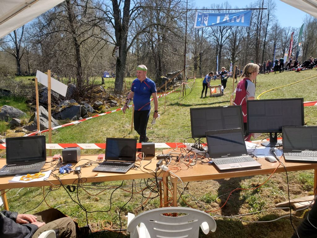 På tävlingen använde vi för första gången en av våra två nya klubbsymboler som vi nyss köpt in. Den blå färgen är lite ljusare än på den gamla. Dessa kommer väl till pass på t.ex. O-ringen och Tjoget då vi kan ha en på arenan och en på campingen. Alternativt kan man ha en vid klubbtältet och en vid upploppet. Även på våra egna tävlingar är det en bra möjlighet att använda de båda.