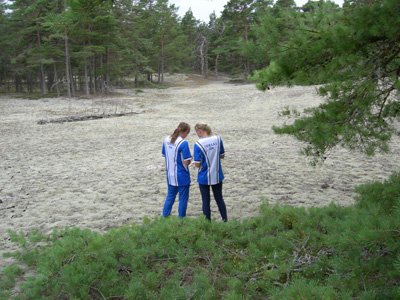 Christian och Elise stämplar vid varsin kontroll på den sista stafetten. |